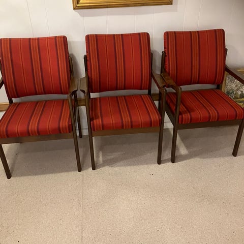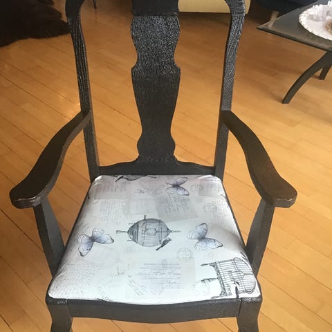 En flott teakstol, med svart trekk. Veldig pent brukt. Har kun en.