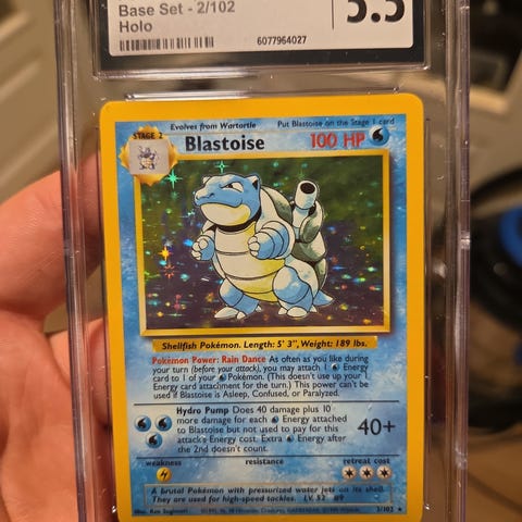 Pokémon Blastoise V samleobjekt kort med 220 HP. Kortet viser Blastoise i vannmiljø med blå og hvite detaljer. Kortet er en del av Pokémon Trading Card Game.