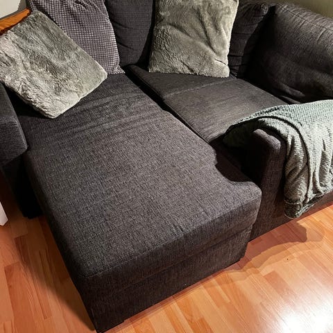 Selger en godt brukt sovesofa billig. Mye bruk igjen. Stort sett pen , men noen flekker på stoffet. Lett å gjøre om til dobbelseng.