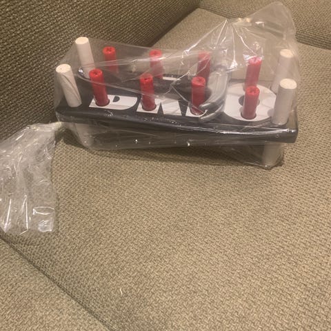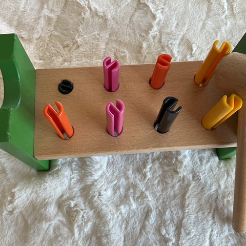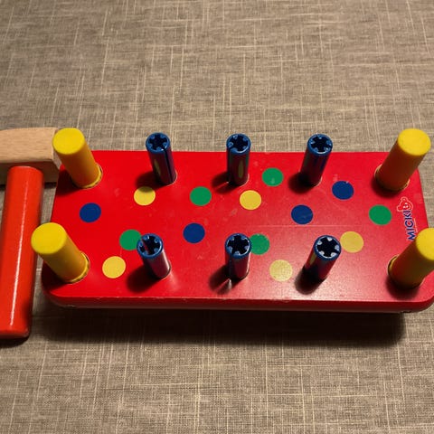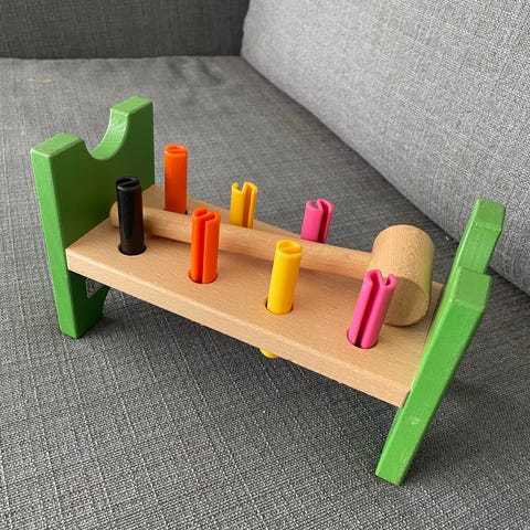 Bankebrett i tre med fem pinner som bankes ned med en hammer i tre. Passer fra 1-3 år.