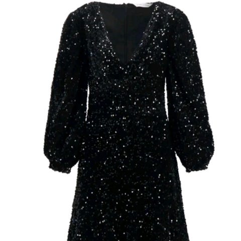 Mimo Sequin Dress" fra Camilla Pihl. Fantastisk fin kjole i sort farge med paljetter over hele. Kjolen har v-hals og lange ermer med mansjetter. Passformen er løs og ledig med lengde litt over kneet. Avtagbart midjebånd. Puff over skuldrene. Lukkes med knapp bak i rygg.