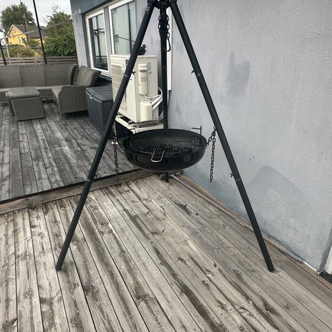 Utekjøkken med tripod i metall, inkludert hengende grillrist og kjeleoppheng. Egnet for utendørs matlaging og bålplass. Justerbar høyde på grillristen ved hjelp av kjede. Stabil konstruksjon med tre ben.