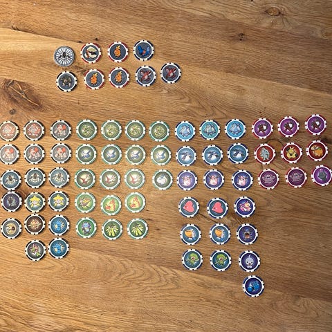 Pokémon samlekort chips med ulike figurer av Pokémon-karakterer. Chipsene er runde, fargerike og har forskjellige motiver. Egnet for samlere og fans av Pokémon-serien . 25kr normal, 40kr legendariske 60 Kr Holo.