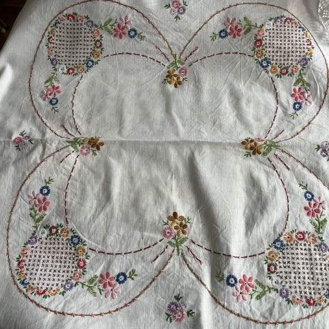 Søkeord: Rosa linduk, brodert duk, vintage duk, lin, linen tablecloth, embroidered, håndverk, retro tekstil, shabby chic, antikk duk, 1950s, 1960s, shabby chic-stil, lys rosa brodert linduk med flekk