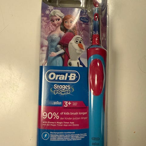Oral-B Vitality Pro KidsFrozen elektrisk tannbørste for barn 773178 har det minste runde børstehodet fra Oral-B med ekstra myk bust, to børstemoduser, et sett med fire utskiftbare klistremerker, en brukstid på 40 minutter og etvakkert reiseetui med selveste Elsa, Anna og Olaf. Denne elektriske tannbørsten gir den skånsomme pleien som barnets tenner trenger, og gjør tannpussen morsom takket være designet og kompatibiliteten med Disney Magic Timer-appen.