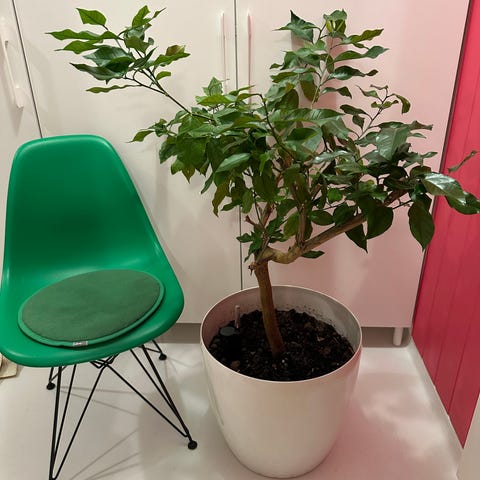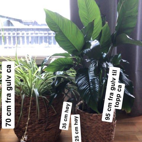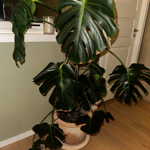 Monstera Deliciosa stueplante med store, grønne blader. Planten har 5 modne blader og langstilkede blader som er karakteristiske for arten. Potte følger med.