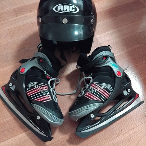 Skøytene har aldri blitt brukt da de ble vokst ifra før de ble tatt i bruk. Har stått i en bod i flere år så esken er litt ødelagt men skøytene er i god stand.