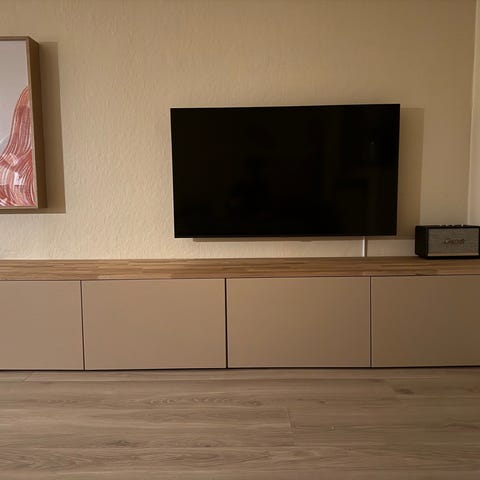 Pen hvit bestå tvbenk følger meg med eik benkeplate.