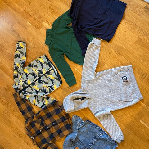H&M barneklær for gutt i størrelse 104 i flere farger. Inneholder ulike plagg i forskjellige materialer og design.