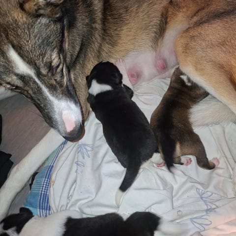 Vi har til salgs 6 flotte husky Saluki valper, 4 hanner og 2 tispe. Født 10.12.2025