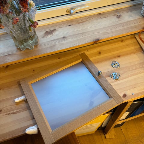 Må være tidligere versjon i hvitbeiset eikefiner og ikke dagens versjon med eikemønster
