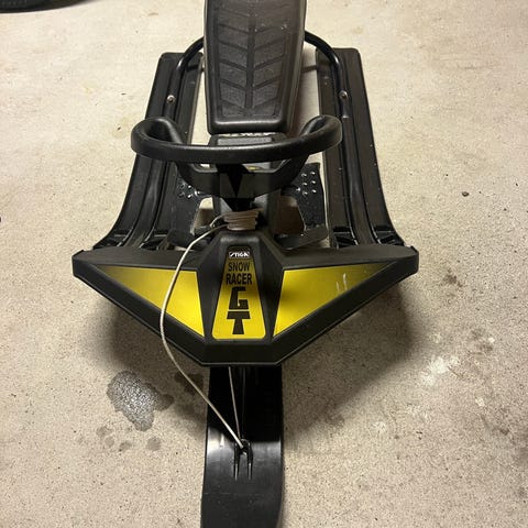 Stiga King Size akebrett med rattstyring. Laget i metall og plastmaterialer, designet for barn. Utstyrt med styringsmekanisme og brems for kontrollert kjøring i snø.