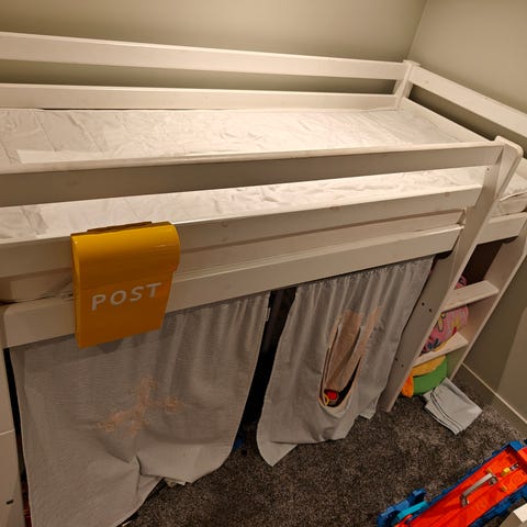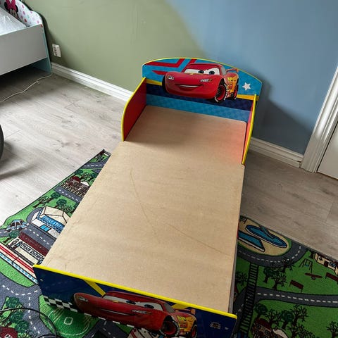 Høy seng til barn med god lagringsplass til leker under. Godt brukt men mange år igjen.