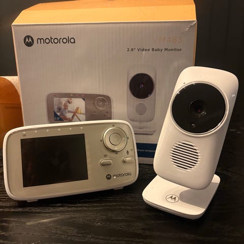 Selger et videobasert babycall system fra Motorola. Brukt i et par år. 1 barn. Kamera-boksen kan evt festes på samme type fester som foto lys og kamera stativ. Kamera-delen må stå i strøm, og monitoren går på batteri. Varer ca «en hel kveld».