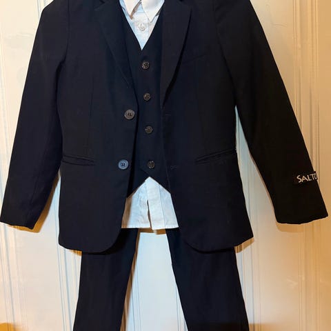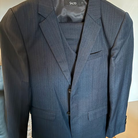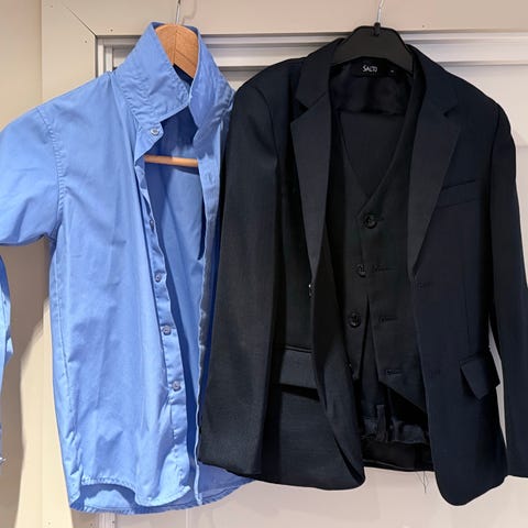 Mørk blå salto dress, med vest i størrelse 158/13 år. Hvit skjorte i str 164. Pent brukt.