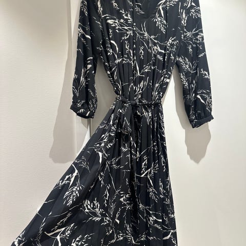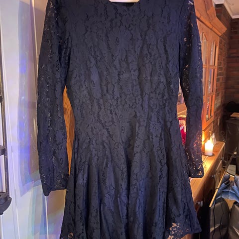 H&M kjole i størrelse 38, svart farge og laget av polyester. Kjolen har lange ermer og dekorative blomsterbroderier på front og ermer. Kan komme på besøk for å prøve