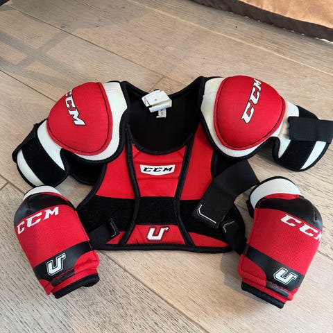 CCM Ishockey skulderbeskytter, rød og svart. Størrelse youth large, passer til ca 110-130 cm. Fin rimelig innstegsmodell.