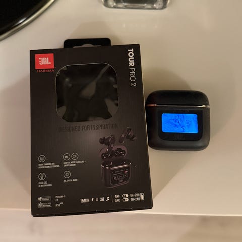Selger et par JBL Tour Pro 2 i svart. Disse er kjent for svært god lydkvalitet, aktiv støydemping og et smart ladeetui med touchskjerm som lar deg styre innstillinger uten å ta opp mobilen. Et solid valg for både jobb, trening og pendling.
