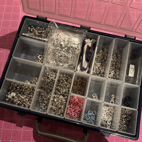 Perlepakke med ulike perler selges. Ulike størrelser og typer perler organisert i en plastboks med flere rom. Egnet for hobby og dekorasjonsprosjekter.