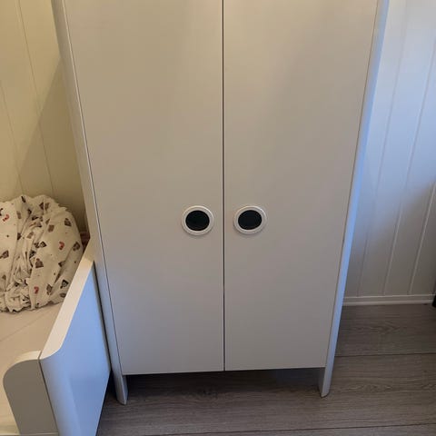 IKEA barneklærskap med to dører og tre skuffer i blått og hvitt. Skapet har oppbevaringsplass til klær, inkludert hengende klær og brettede plagg. Passer til barnerom for organisering av klær.