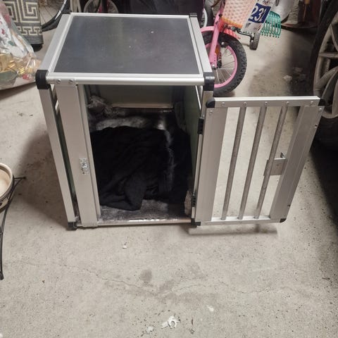 Dogman Hundebur i metall med bærehåndtak og pute. Buret har en svart farge og inkluderer en pute for komfort. Egnet for transport og oppbevaring av hunder.