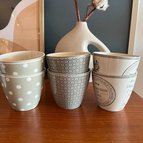 Kopper fra Greengate, de fleste i gråtoner. Selges samlet eller separat.