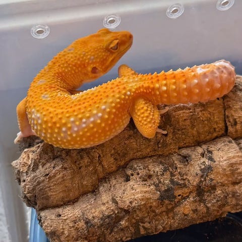 Han er frisk og fin, skifterham, spiser og går på do som hun skal. Leopard gekko er en av de artene som er godt egnet for både nybegynnere og erfarne reptileiere da de er veldig rolige og en enkel art å holde.