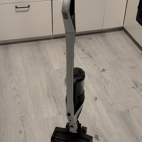 Miele støvsuger, stanga kan tas av og bare brukes for hånd. Lett og rengjøre. Følger også med utstyr og ladestasjon.