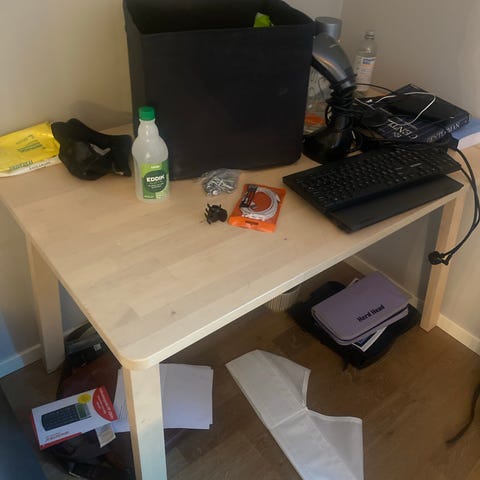 Skrivebord i sort farve, pent brukt, men med noe bruksmerker fra kontorstol som har vært litt for bred. Kan fint males over for å friske opp. Robust og litt tyngre pult med masse lagringsplass. 2 skuffer og 2 hyller i skap. Selges da vi vil ha større skrivebord. Kjøpt sommeren 2024.