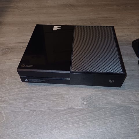 Microsoft Xbox One spillkonsoll i svart farge. Konsollen har flere tilkoblingsporter inkludert USB og Ethernet. Designet for hjemmeunderholdning og spill.