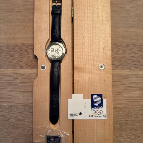 To Seiko OL-klokker fra Lillehammer 1994. Offisielle OL-utgaver med motiv fra vinter-OL og teksten Citius Altius Fortius.