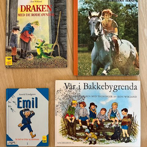Astrid Lindgren Emil og Pippi barnebøker med alle Emil- og Pippi-historiene. Inneholder historier om Emil fra Lønneberget og Pippi Langstrømpe. Bøkene er på norsk og inkluderer innholdsfortegnelser for enkel navigering. Lapp over navn på boksen