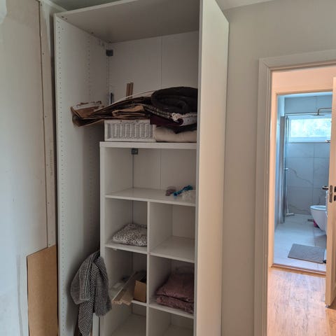 Det er saget hull til strømkontakt og ett hull på skapets venstre sideplate (se bilder).