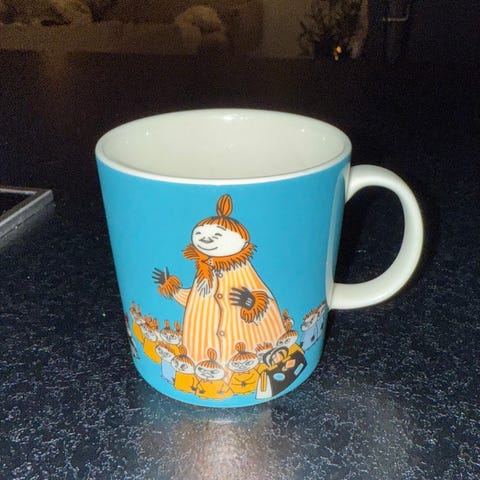 Arabia Mummi krus med vintermotiv som viser Mummitrollet og andre figurer i snødekt landskap. Kruset er laget av porselen og har et håndmalt design med fargerike detaljer. Egnet for daglig bruk til varme drikker.