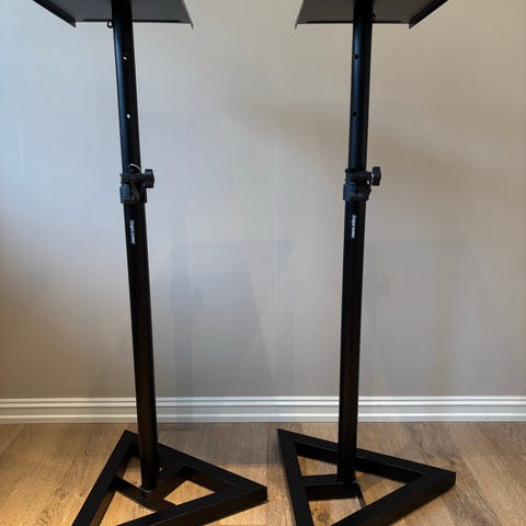 Selger høyttalerstativ (2 stk, som på bildene) da jeg skal over til en annen løsning. Brukt med et par Adam A7X til nå. Stativene ser fine ut.