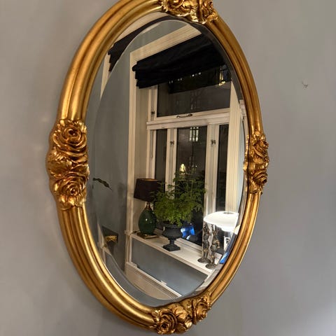Vakkert, utskåret trepanel med speil. Panelet har rikt detaljerte utskjæringer og et tidløst, orientalsk uttrykk som gir varme og karakter til rommet.