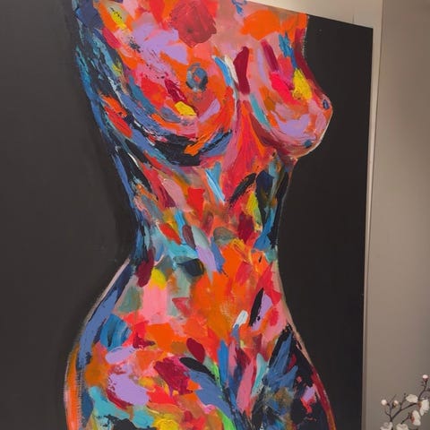 Maleri som viser en abstrakt kvinnefigur med markerte farger og konturer. Kunstverket har en kombinasjon av varme og mørke toner, med fokus på kroppens form og bevegelse. Passer til dekorasjon i moderne interiør.