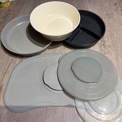 Godt brukte skåler fra Twistshake og en silikonmatte til å skru skålene fast på. Matten er så og si ubrukt.