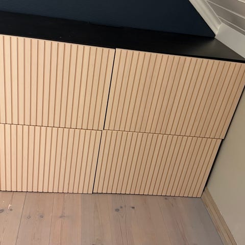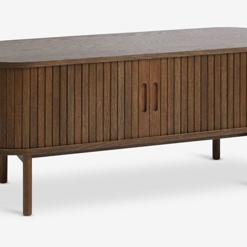 Massiv eik, eikefinér og folie. Med sjalusidører. B120 x H50 x D40 cm