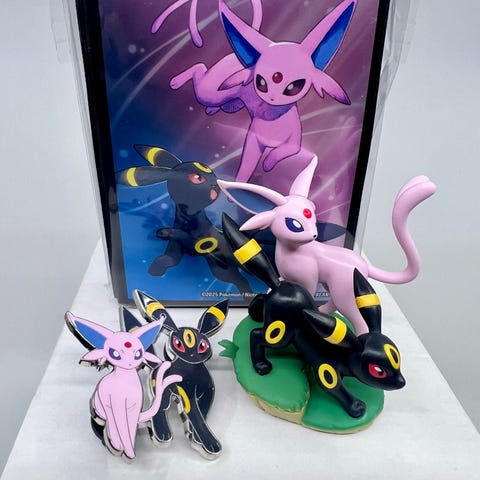 Espeon og Umbreon rekvisita fra Prismatic Evolutions Premium Figure Collection.