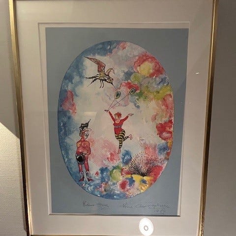 Abstrakt kunstmaleri som skildrer en kvinne i en svart kjole. Maleriet har en uttrykksfull stil med fokus på form og farger.
