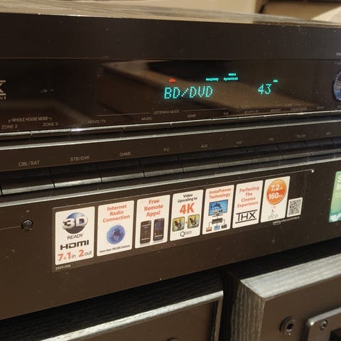 Pioneer AV-mottaker med flere tilkoblingsmuligheter på baksiden, inkludert HDMI, lyd- og videoinnganger, samt høyttalerterminaler. Enheten har to store knotter på frontpanelet for volumkontroll og valg av inngang.