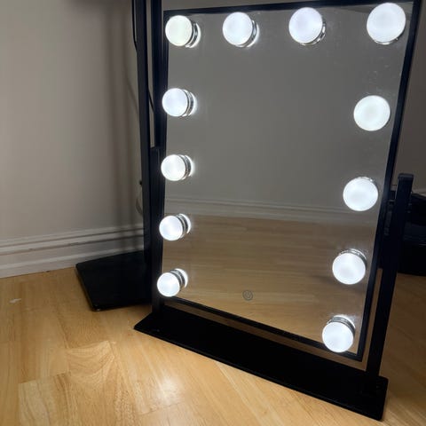 North light speil med lys, hvit ramme og innebygde lyspærer rundt kanten. Speilet har støtteben for bordplassering og strømbryter på siden. Drives med 8 AA-batterier (ikke inkludert). Laget i Kina.