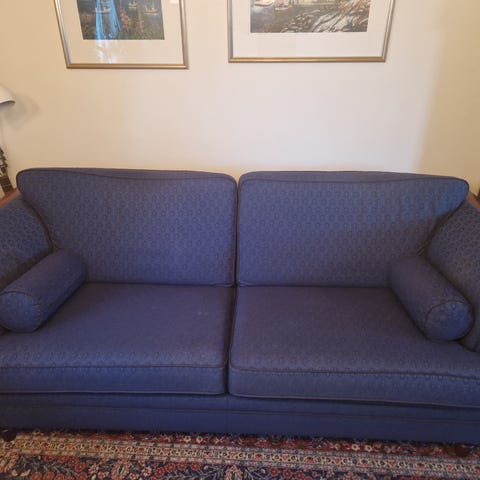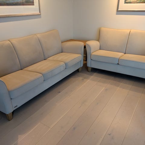 Pent og beskjedent bruk av salong. Selges nå billig. Dette er en kvalitets sofa fra norske Brunstad. Hel og fin, litt solbleket på vangen som har stått mot sola. Gode og faste puter som er vendbare, i skåret skum. Mål er : dybde 83. Høyde 86. Sittehøyde 44. Sittedybde 52. Plassbehov 205/150 cm.