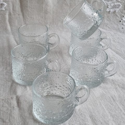 Seks tallerkener, fire kaffekrus, et fat og én telysholder i nydelig håndlaget keramikk. Lyse, duse glasurfarger. I god stand.