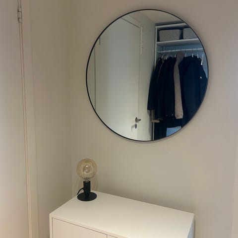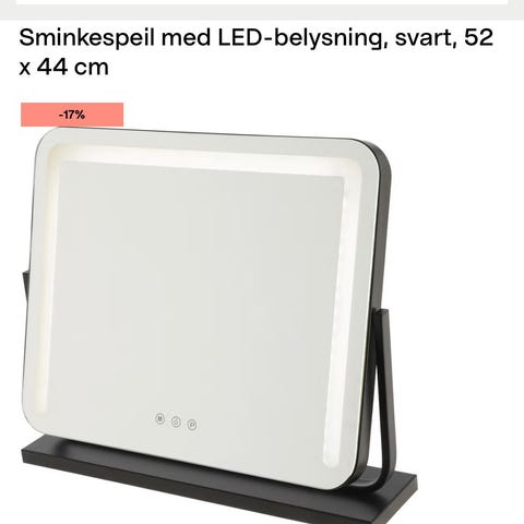 Clas Ohlson speil med lys rundt kanten. Passer til bruk som sminkespeil eller dekorativt speil i hjemmet. Tar batteri ellers kan man bruke ledningen som kan kobles til ein stikkontakt som følger med. Kan både festes til veggen eller bruke standen. Speilet er i god stand.