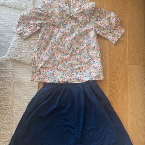 Blusen har korte ermer og fin fasong, skjørtet er luftig og behagelig med god vidde og underskjørt. Stoffet faller pent og er komfortabelt å bruke.