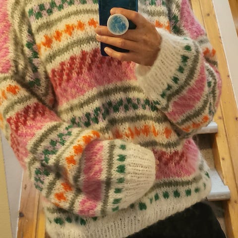 Strikket etter hanami-mønster, i gjestal soft - som består av 50%akryl og 50% alpakka. Størrelsen er kanskje en stor M eller liten L. Se mål på bildene. Røyk og dyre-fritt hjem.
