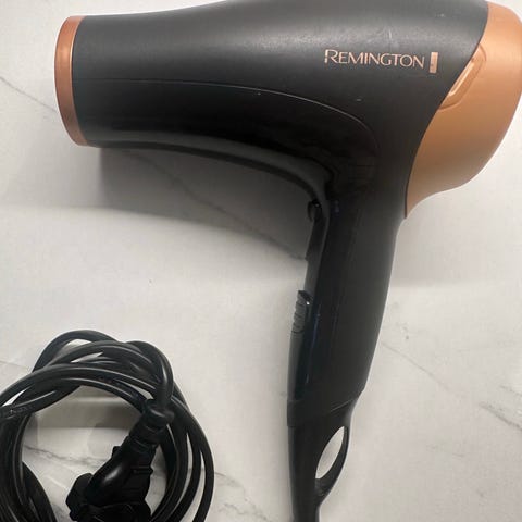 Remington hårføner i svart farge med avtakbar munnstykke for styling. Utstyrt med flere varme- og hastighetsinnstillinger, og en kaldluftknapp for å fikse frisyren. Ledning med strømstøpsel for bruk i vanlige stikkontakter.