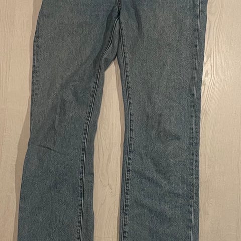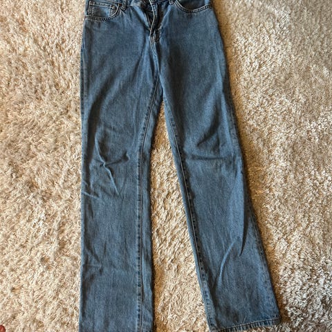 Bik Bok Low Straight denimjeans i blå farge. Størrelse S med midjevidde W27 - Lengde 27. Laget av denimmateriale. Designet for kvinner.